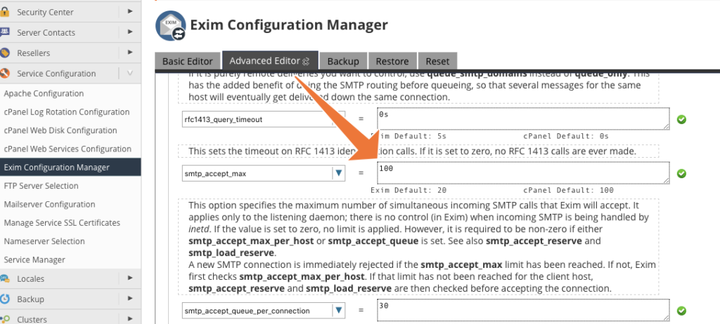 The “smtp accept max” directive in Exim’s configuration file controls the limit. In WHM, navigate to the Exim Configuration Manager under Service Configuration in the sidebar menu to change this value.