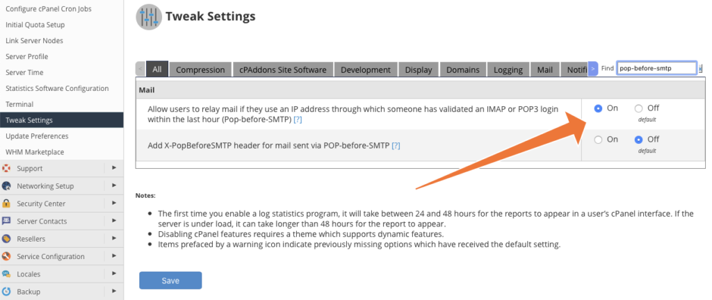 Navigate to the Tweak Settings interface, which is located in the WHM sidebar menu under Server Configuration. Look for “Pop-before-SMTP” and turn it on.