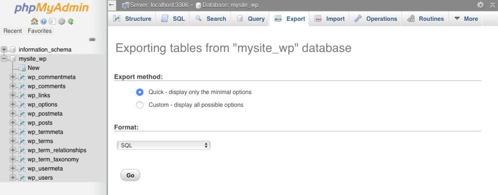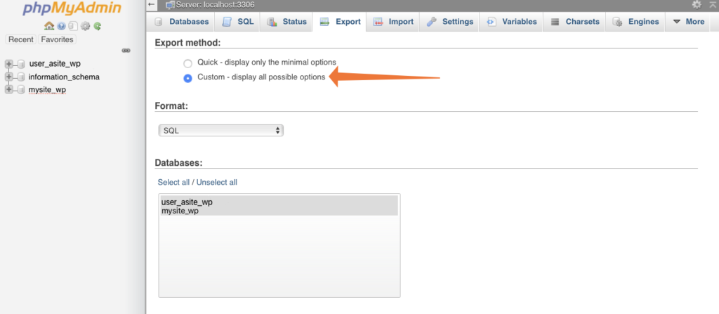 In most cases, the Quick setting provides the best export configuration for MySQL backups, but the Custom setting is useful for excluding tables, renaming the exported file, and performing the more advanced configurations. If you want to export multiple databases at the same time, open phpMyAdmin and, without selecting a database in the sidebar, click the Export tab. The Quick export method by default will export all available databases. Choose the Custom export method and select the databases you want to back up to customize which ones are exported.