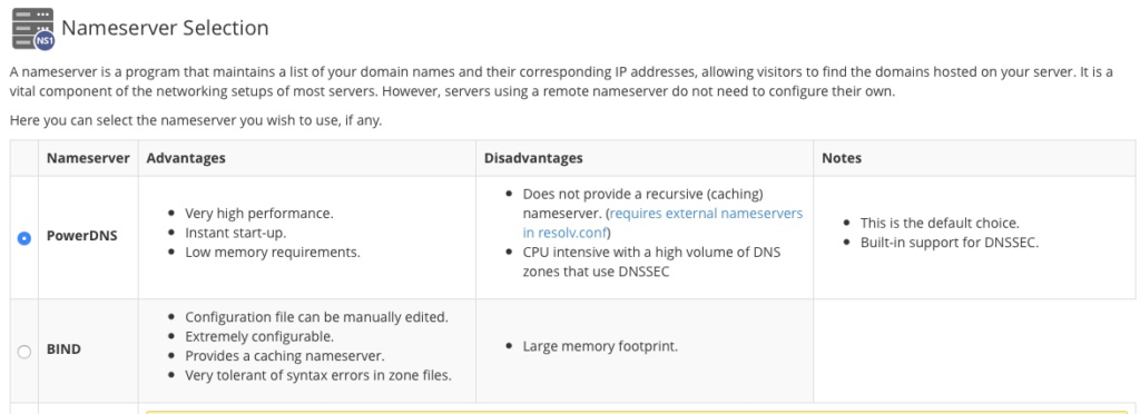 PowerDNS, a high-performance server with low memory requirements, is integrated into cPanel. PowerDNS is the default, but you can also choose BIND if you need recursive DNS or to manually edit zone files.