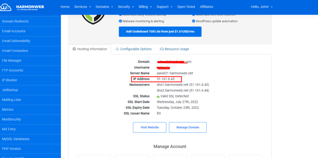 If you have your domain pointed to a CDN like Cloudflare, then you will need to create an A record for the subdomain in your Cloudflare DNS management area. The A record must point to our server IP given to you when you purchased a hosting account from us. You can also see the IP from the hosting account information in your client area. Simply log in to your client area, Services> Select the particular service> and scroll down, see the image below.