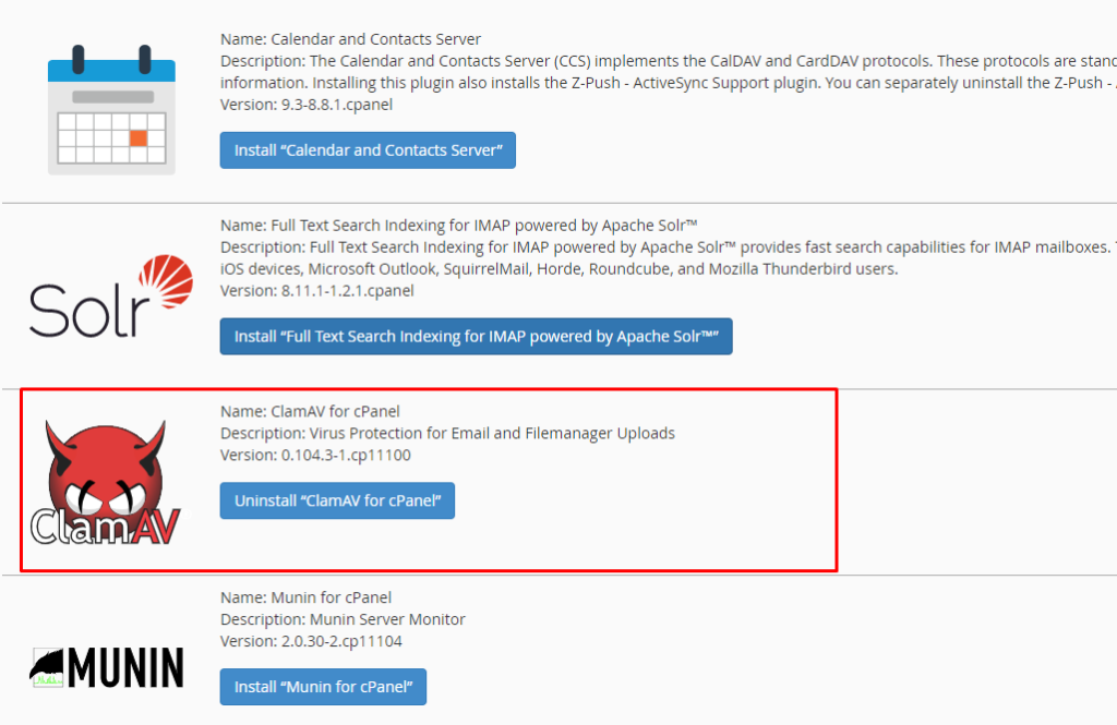 ClamAV is one of the most popular open-source antivirus plugin available for cPanel servers. Clam AntiVirus is an open-source (GPL) anti-virus toolkit for UNIX, designed especially for e-mail scanning on mail gateways. It provides a number of utilities including a flexible and scalable multi-threaded daemon, a command line scanner, and an advanced tool for automatic database updates. It has built-in support for all standard mail file formats, various archive formats, executable formats, and popular document formats. The core of the package is an anti-virus engine available in a form of a shared library. This article will explain to you the steps to install ClamAV plugin from WHM.