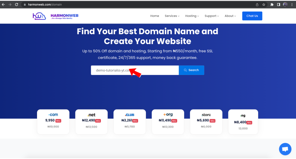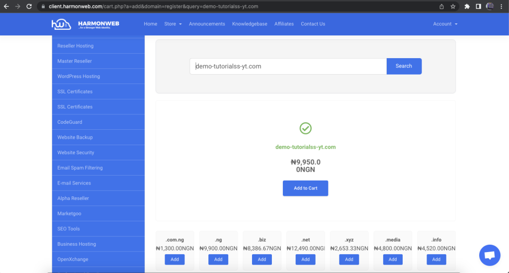 In this section, you can scroll down to view the list of domain extension and their prices. when you decide on the one you want to use, you can use the search option to search for the name you want to use for your website by adding your preferred domain extension.