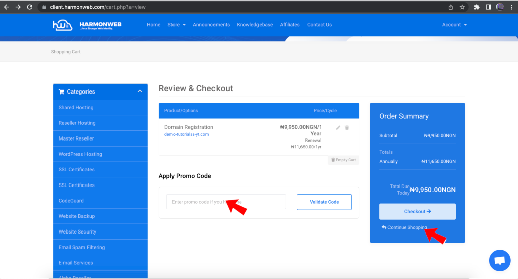 In this section, you can click continue shopping if you want to purchase more that one domain. Also you can apply a promo code if you are assigned any by Harmonweb Billing Support.